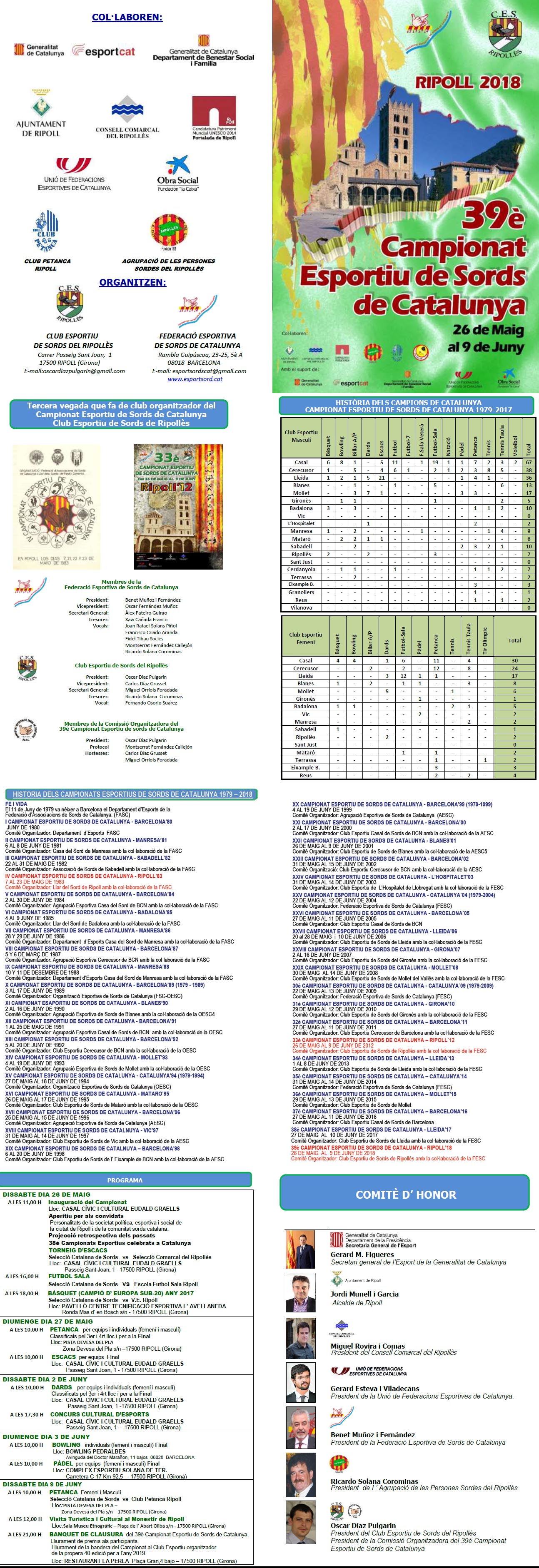 Finalment, per tancar aquest 39è Campionat es va fer la Entrega de la bandera del Campionat a l’organitzador de la propera 40è edició per l’any 2019 al Federació Esportiva de Sords de Catalunya Els modalitats esportives en general: futbol-sala, futbol, basket, tennis de taula, tennis, Padel, etc. |