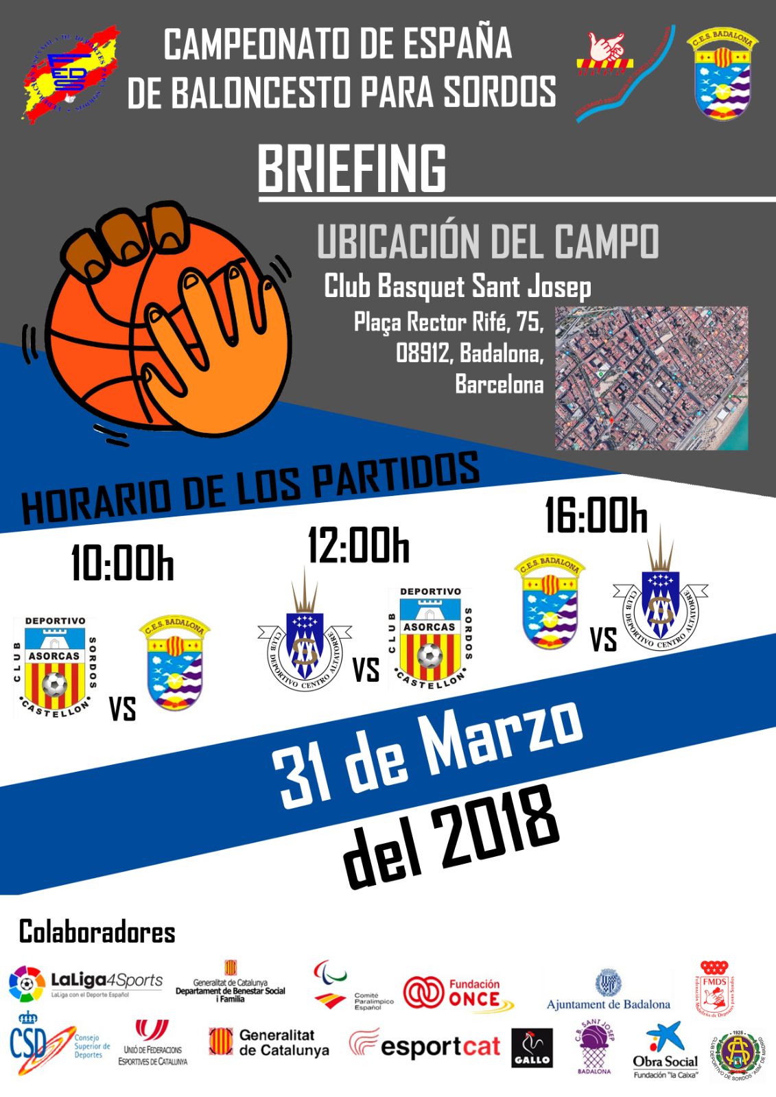 El dia 31 de març de 2018, se celebro CAMPIONAT D'ESPANYA DE BÀSQUET PER A SORDS organitza CLUB ESPORTIU DE SORDS DE BADALONA amb la col·laboració FEDERACIÓ ESPORTIVA DE SORDS DE CATALUNYA,.