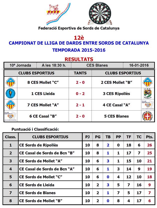 Vuere els reslutats de la lliga de dards 2015 -2016