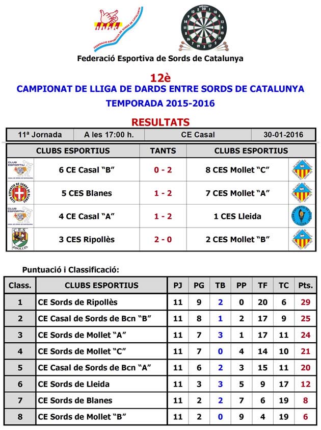 Vuere els reslutats de la lliga de dards 2015 -2016