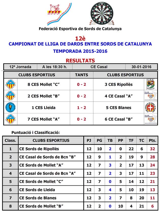 12è CAMPIONAT LLIGA DE DARDS ENTRE SORDS DE CATALUNYA - TEMPORADA 2014-2015