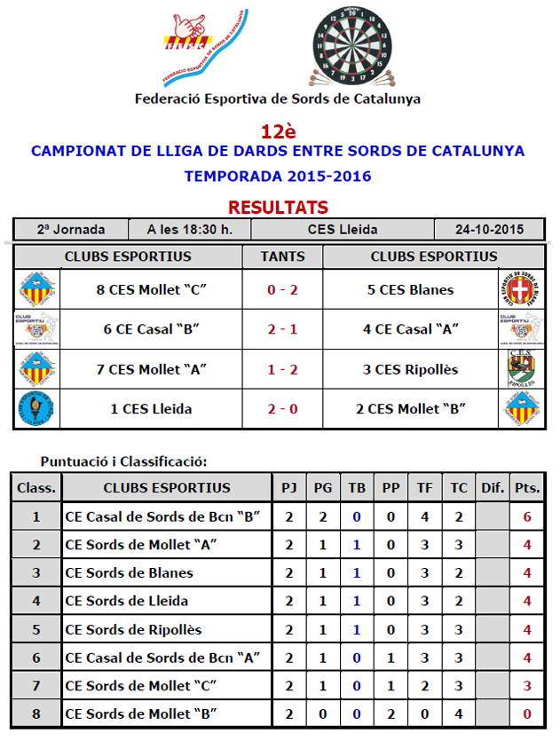 12è CAMPIONAT LLIGA DE DARDS ENTRE SORDS DE CATALUNYA - TEMPORADA 2014-2015