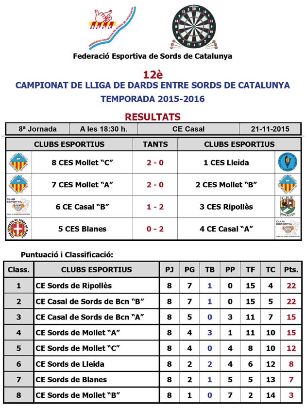 12è CAMPIONAT LLIGA DE DARDS ENTRE SORDS DE CATALUNYA - TEMPORADA 2014-2015