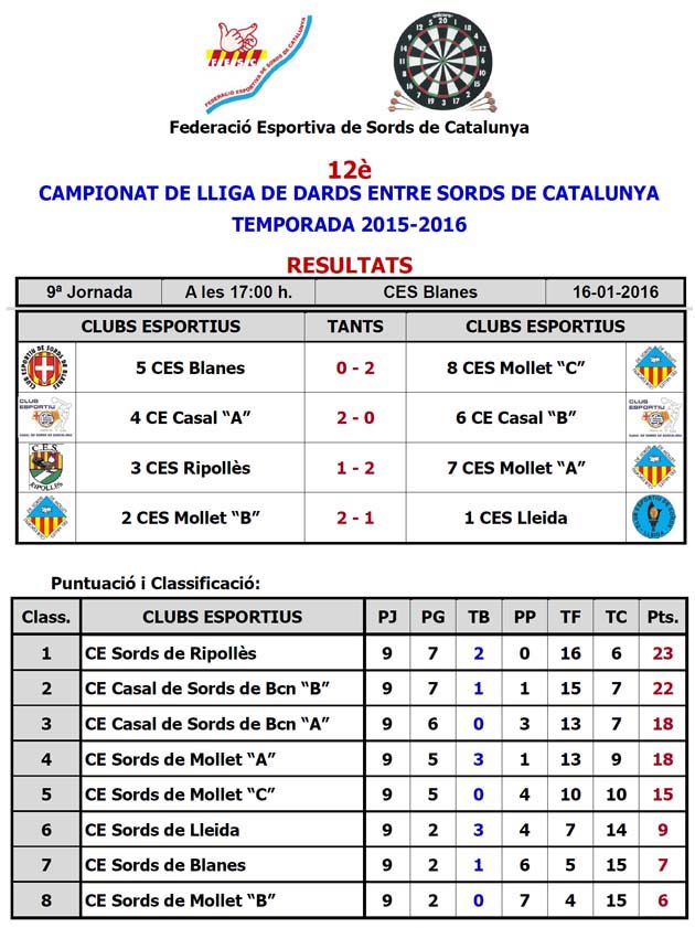 Vuere els reslutats de la lliga de dards 2015 -2016