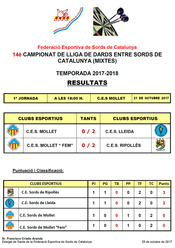 14è CAMPIONAT LLIGA DE DARDS ENTRE SORDS DE CATALUNYA - TEMPORADA 2017-2018