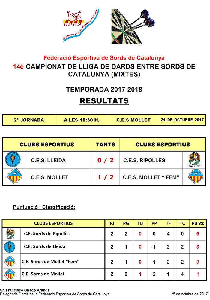 14è CAMPIONAT LLIGA DE DARDS ENTRE SORDS DE CATALUNYA - TEMPORADA 2017-2018