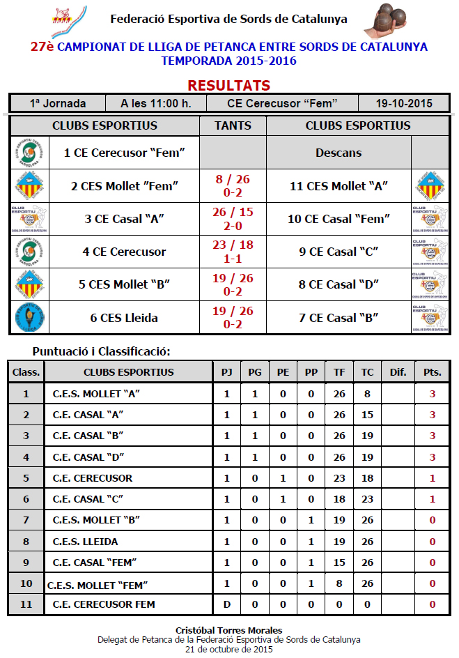 27è CAMPIONAT LLIGA DE PETANCA ENTRE SORDS DE CATALUNYA - TEMPORADA 2015-2016