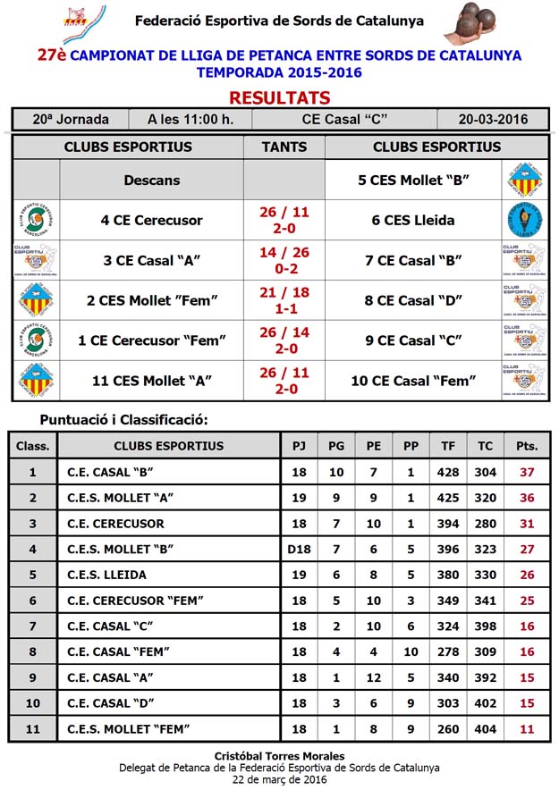 27è CAMPIONAT LLIGA DE PETANCA ENTRE SORDS DE CATALUNYA - TEMPORADA 2014-2015