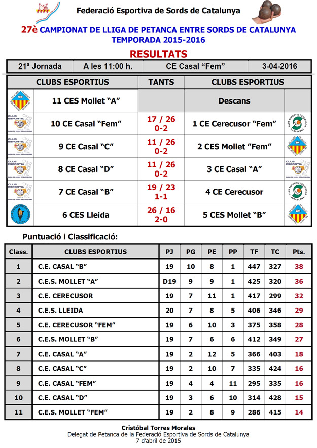 27è CAMPIONAT LLIGA DE PETANCA ENTRE SORDS DE CATALUNYA - TEMPORADA 2014-2015