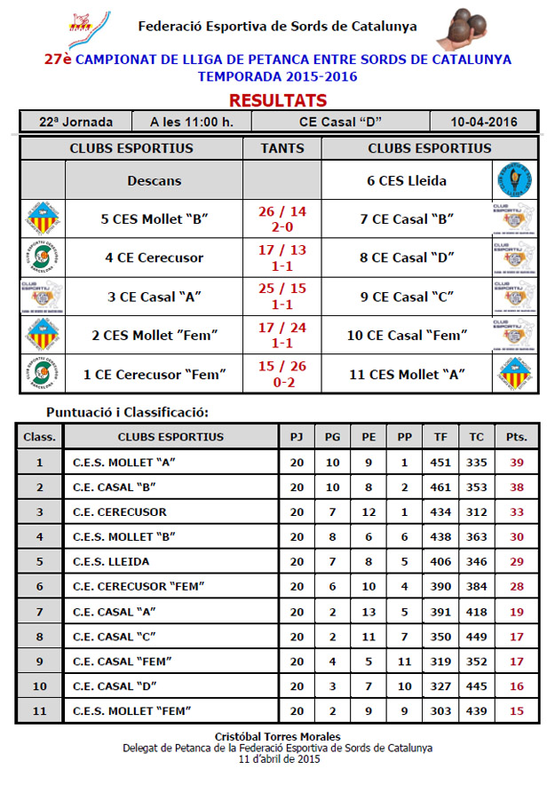 27è CAMPIONAT LLIGA DE PETANCA ENTRE SORDS DE CATALUNYA - TEMPORADA 2014-2015