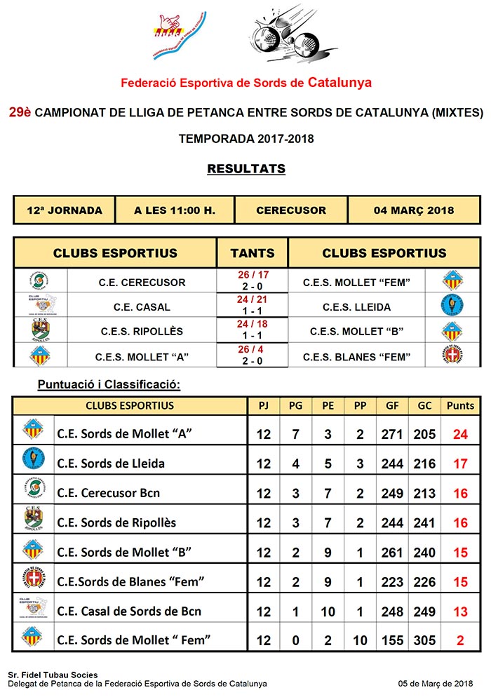 29è CAMPIONAT LLIGA DE PETANCA ENTRE SORDS DE CATALUNYA - TEMPORADA 2017-2018