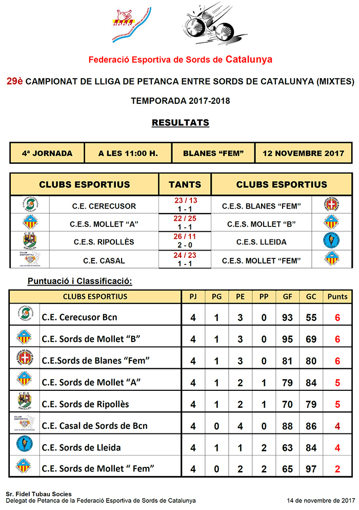 29è CAMPIONAT LLIGA DE PETANCA ENTRE SORDS DE CATALUNYA - TEMPORADA 2017-2018