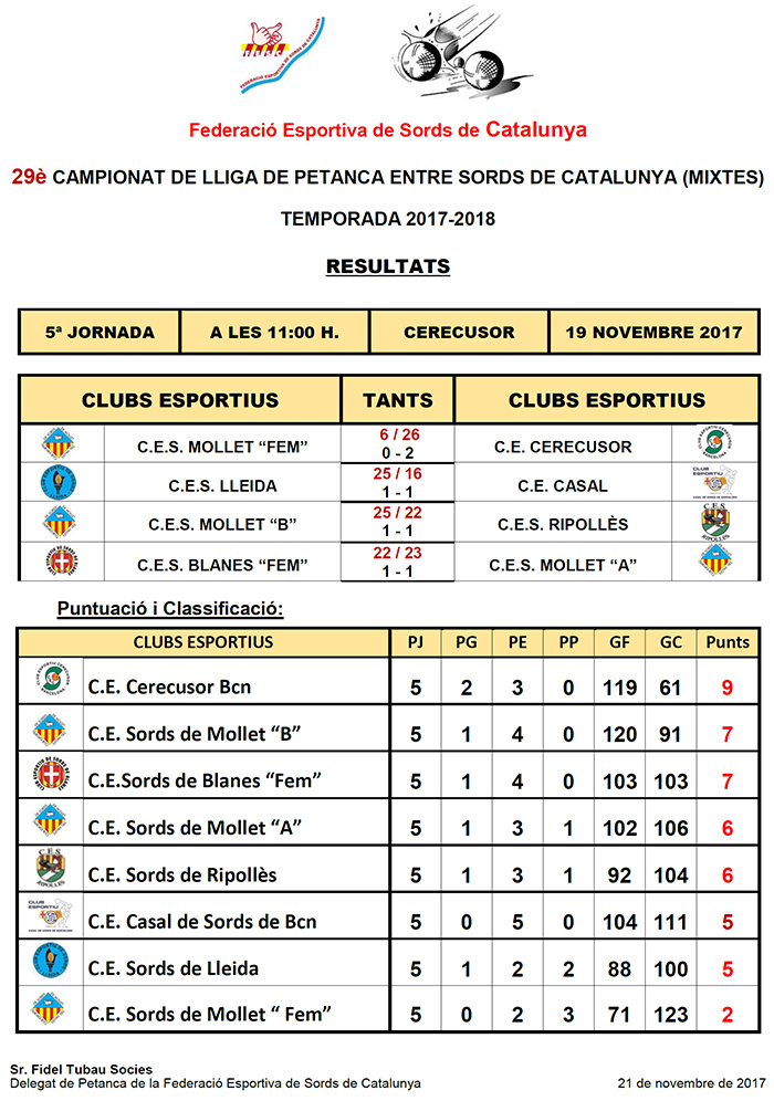29è CAMPIONAT LLIGA DE PETANCA ENTRE SORDS DE CATALUNYA - TEMPORADA 2017-2018
